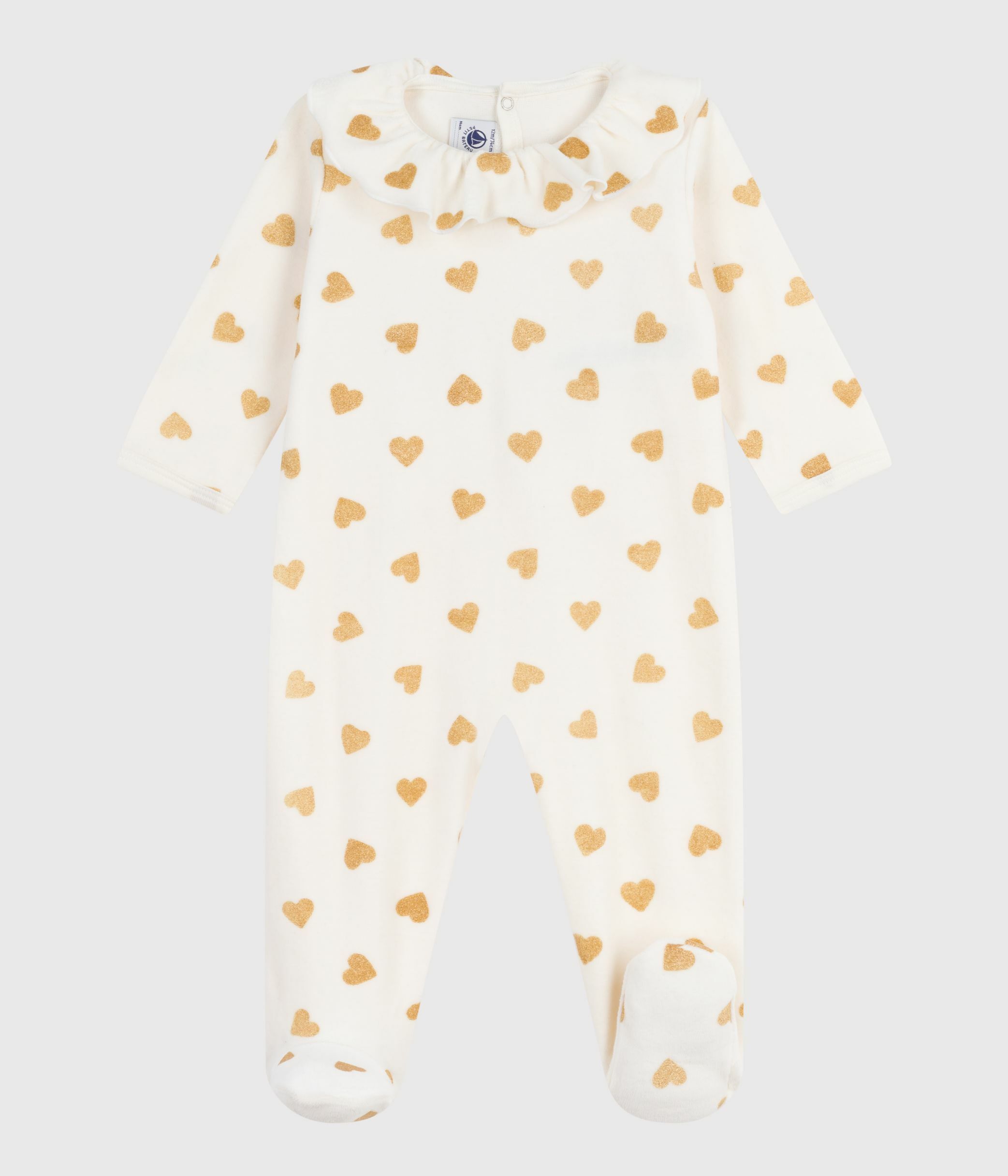 Baby pajamas in velvet with opening at the back and printed with sequined hearts
